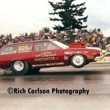 passenger wagon in I stock automatic. But the need for speed was growing, and over that winter built, the original GUNFIGHTER, a 57 Ford Custom 300, powered by a Hilborn injected 289 small blocks and an aluminum Borg Warner 4 speed. I raced in a class called D/Altered, and I think the best passes were in the low 11s at about 120 mph. After a flip-top 69 fiberglass Mustang and 71 Comet, I sold everything at the end of the 1972 season and started building a Pro Stock Pinto.
